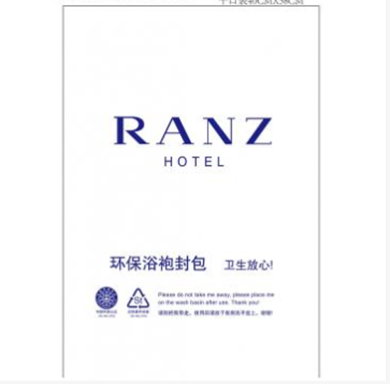 【名称】一次性浴袍封包袋 【尺寸】40X58CM 【厚度】加厚 【材质】HDPE全新料 【颜色】白色,单面单色印刷,分为Ranz、Rany两种标识,起订数量:20000
